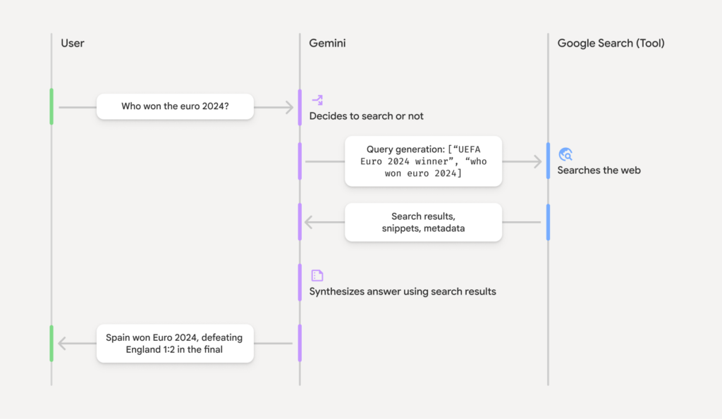 GoogleのGeniniでは、「Google 検索によるグラウンディング」というページでAI検索の仕組みについての概念図を掲載しています。