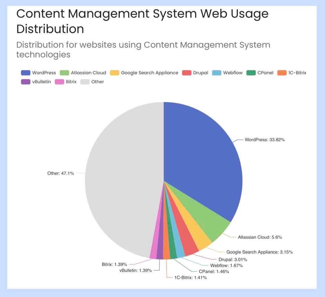 BuiltWithの調べによる別のデータだと、WordPressは33.8%で、w3techsのシェア率より下がりますが、やはり圧倒的な1位であることには変わりありません。