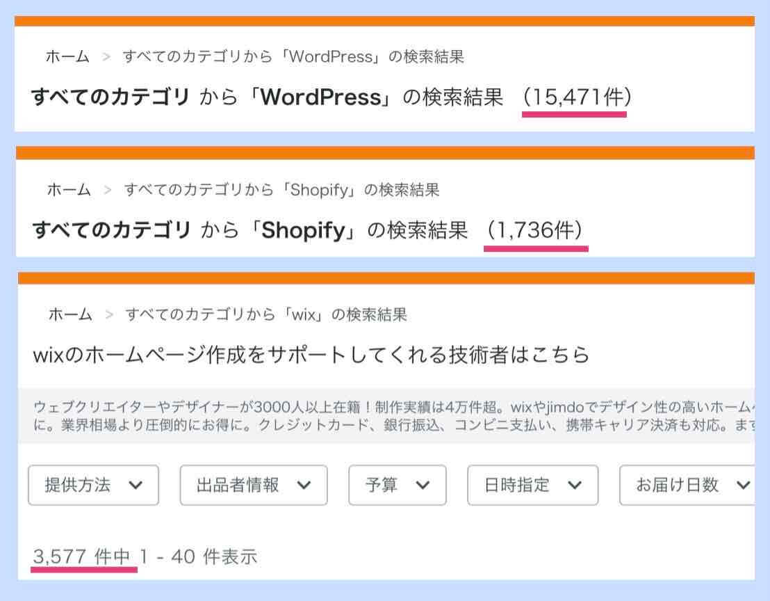 やはりWordPressが抜けて一番多いです。どの専門家が良いか選ぶのは大変ですが、この数は心強いですよね。