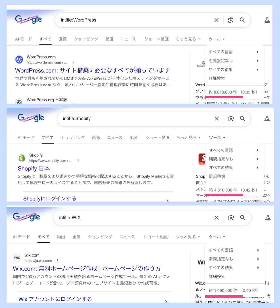 それぞれGoogleで検索(※)した結果のヒット数は下記の通りでした。