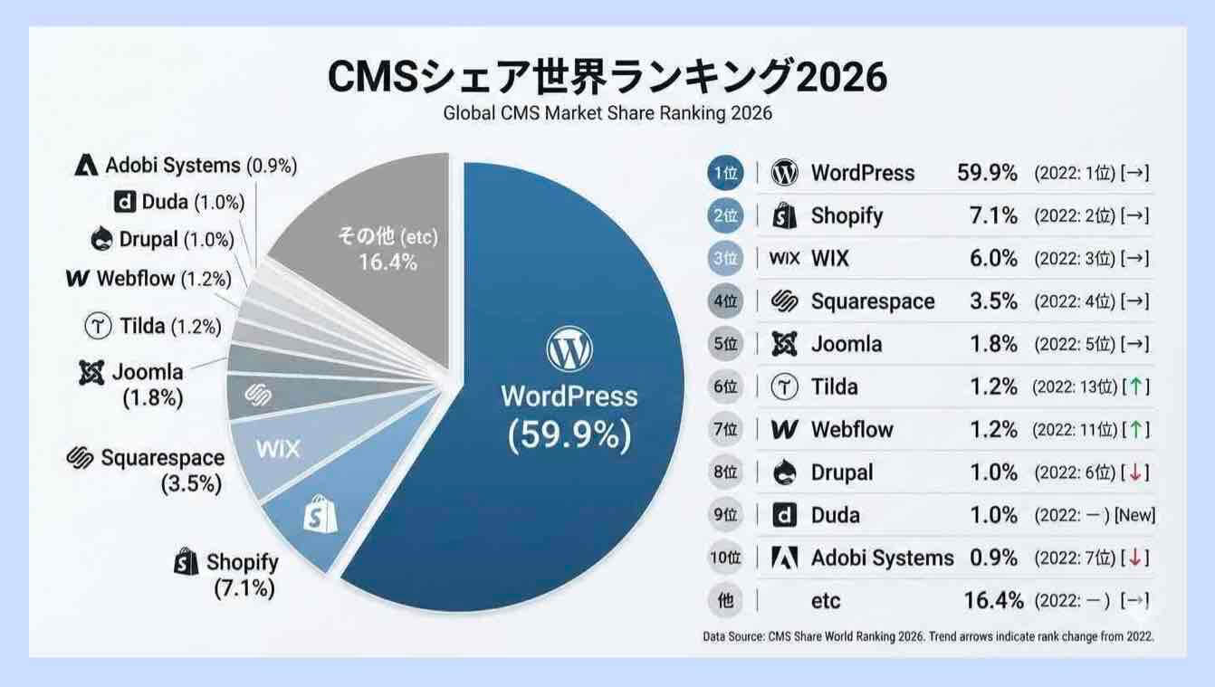 更新履歴:この記事は、2022年に公開したCMSシェアランキングの記事を、2026年2月時点の最新データで更新したものです。過去4年間の推移も含めて分かりやすく解説しています。