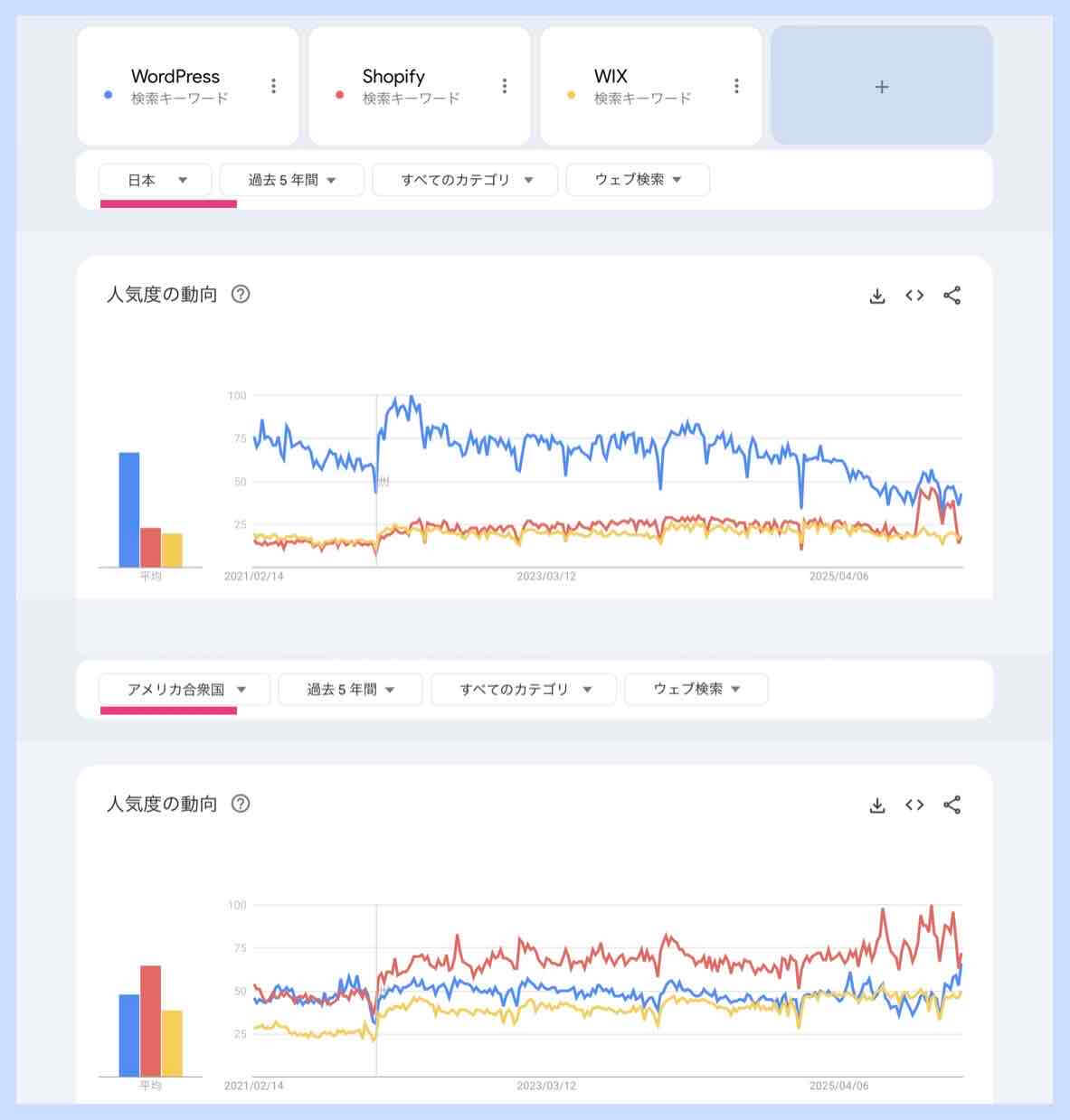 ここ5年間(2021-2025)の日本とアメリカの検索ボリュームの推移をGoogleトレンドを用いて調べてみました。