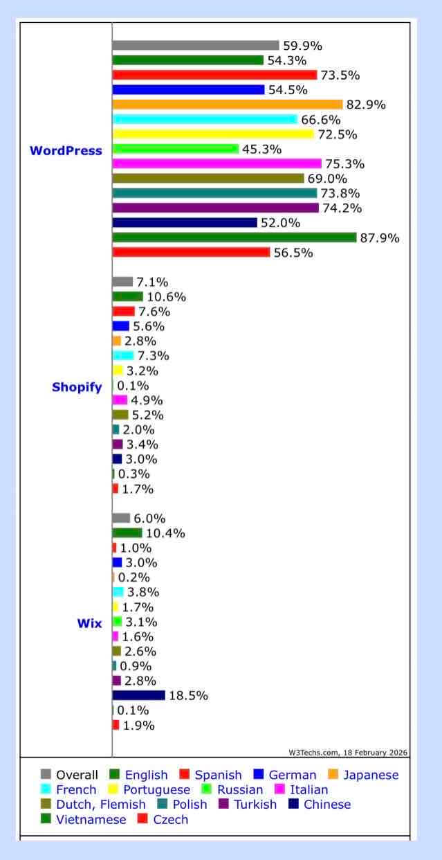 2026年2月時点でのCMSのシェアは、WordPressが 59.9% で圧倒的なランキングの1位です(2位以下は本文で説明)。